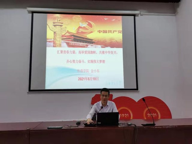 5月18日,外语学院第48期入党积极分子培训班第三讲在外语学院报告厅开展。本次党课主题为“汇聚青春力量,高举爱国旗帜,共推中华复兴,齐心努力奋斗,实现伟大梦想”,由外语学院党委副书记金小东老师主讲。