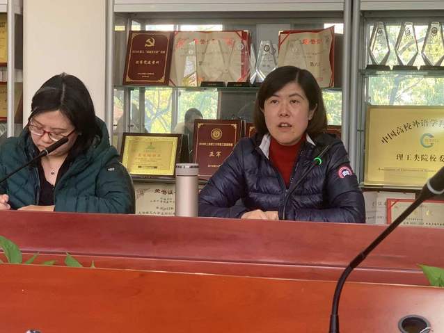 之后,三位副主任贾晓云、祁小雯和沈谢天也分别汇报了各自分管工作的最新进展与面临的问题与挑战。贾晓云梳理了教学任务落实、教材填报审核、期中教学检查、期末教学安排等四方面的系部教务工作细节,强调了2021年“思政融入综英课堂”、申报“上海市一流课程”等教学工作亮点,同时也回顾了过去一年教学任务安排方面的难点及突发状况,并对未来一年的教务工作进行了展望。负责系部国际合作与交流事务的祁小雯聚焦“2+2”项目的课程、师资、学生对外交流等三方面,重点分享了与美方合作开展的课程、外教的聘用与考核情况以及学生参与“2+2”项目及其它对外交流项目的情况。沈谢天结合具体数据,对本系教师和学生在各项校级以上教学、学科竞赛中的参与和获奖情况作了详细说明。