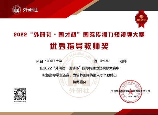 孟小果老师获优秀指导教师奖