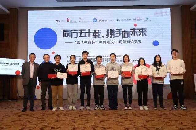 为纪念中德建交50周年,回顾过去并展望未来,进一步丰富中德人文交流,同济大学中德学部、同济大学中德人文交流研究中心、同济大学德国研究中心与中国德国友好协会联合主办的“光华教育杯”中德建交50周年知识竞赛团体赛于12月3日在上海举行并圆满落幕。我院德语系学生唐静、陈芊玥、陆沛譞在周磊老师的指导下,通过充分的赛前准备,凭借深厚的人文素养,经过六轮激烈角逐荣获三等奖。指导老师周磊荣获优秀指导教师奖。