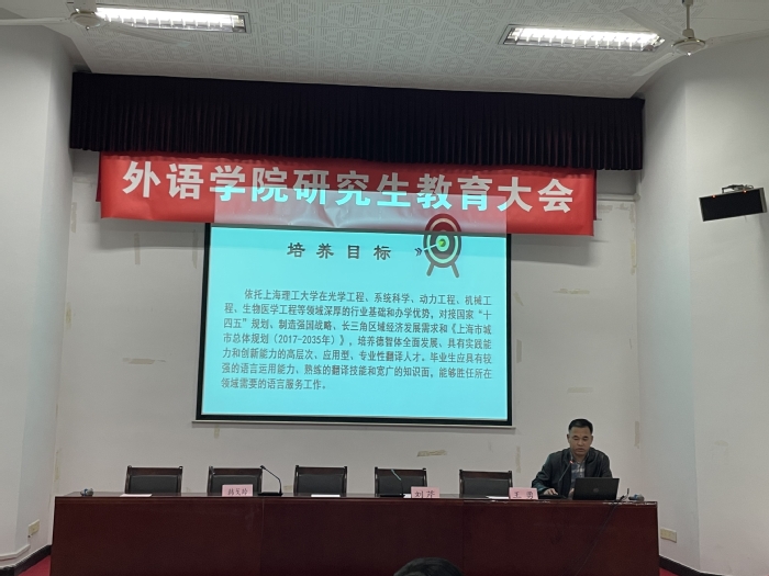 本次大会的主题是提高2022级研究生的思想认识,明确研究生阶段的学习要求和就业规划。大会伊始,外国语言文学学科负责人刘芹院长详细介绍外语学院的历史沿革、学科结构、师资力量、学院设施、在校学生规模、毕业生考取博士情况及国际交流项目,着重介绍了外国语言文学专业的培养方案,强调学科特色和亮点。接着,MTI翻译教育中心主任王勇教授对翻译硕士专业的整体情况、师资力量、翻译技术和国际合作等方面进行全面介绍,详细说明翻译专业硕士的实习实践、学分要求及学业要求等。接下来,学院国际交流秘书曹秋晨老师详细介绍学院现有的国际交流项目,向同学们讲解相关注意事项,包括语言成绩要求、项目招生时间、相关手续办理、学费等,并分享项目咨询的联系方式和国际交流项目的网站。学院资料室管理员戴欢老师介绍学院多媒体资料室的历史、馆藏情况和借阅须知等内容,方便研究生到资料室图书阅览和查找资料。最后,韩戈玲副院长介绍学位点概况,说明学分与学位的关系,解释学院对研究生科研与获奖的资助文件,强调在读研究生应该认真遵守纪律,加强学术研究的严谨性和独创性,全面提高学术素养,建议同学们选定人生目标,提前做好暑期实习计划,逐步落实职业规划。