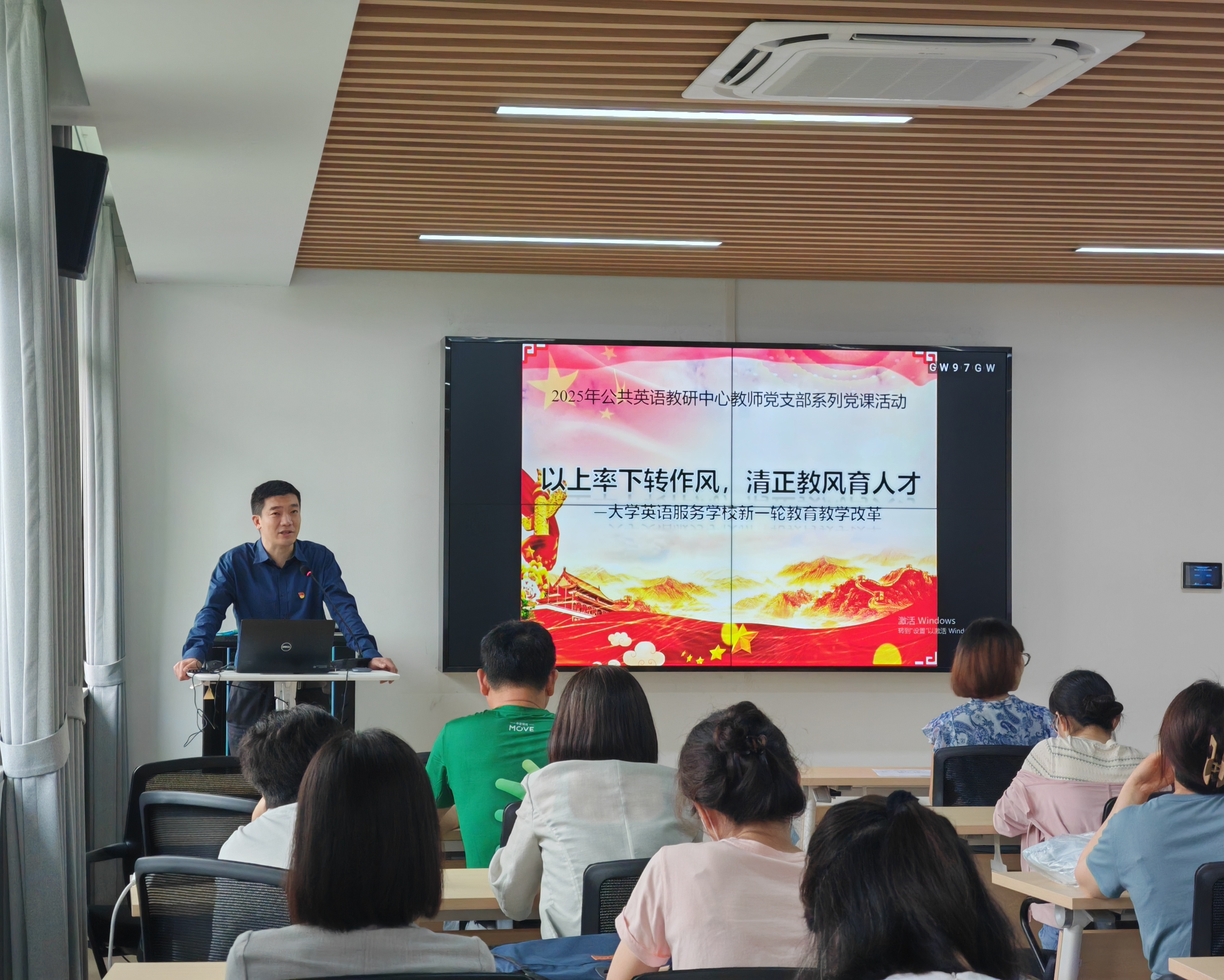 6月13日,公共英语教研中心党支部在外语楼502召开全体党员大会。大会由学院党委委员、外语学院副院长张乐为全体支部党员讲授了主题为"以上率下转作风,清正教风育人才"的专题党课。