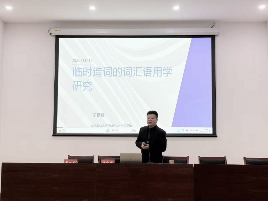 第七届研究生学术论坛颁奖仪式后,我院特邀长春工业大学王相锋教授作 “临时造词的词汇语用学研究”专题讲座。王教授围绕临时造词的即时性、临场性、灵活性核心特征,以关联论为视角,结合实例解析其语用机制与多元语用功能,还细致解答师生相关提问。最后,韩戈玲副院长强调讲座价值并鼓励研究生关注语言实践开展研究。此次讲座不仅为师生们搭建了与语言学权威专家交流的平台,更深化了大家对临时造词及词汇语用学的理论认知,为我院在语言学研究领域的人才培养和学术创新注入了新的活力。